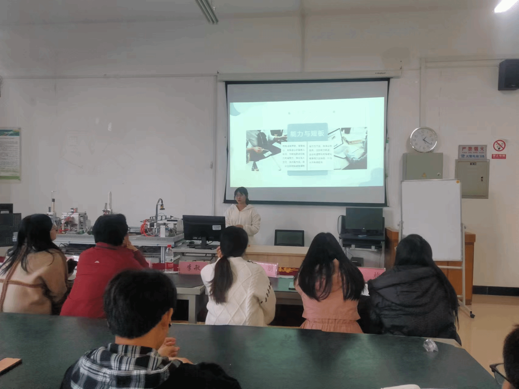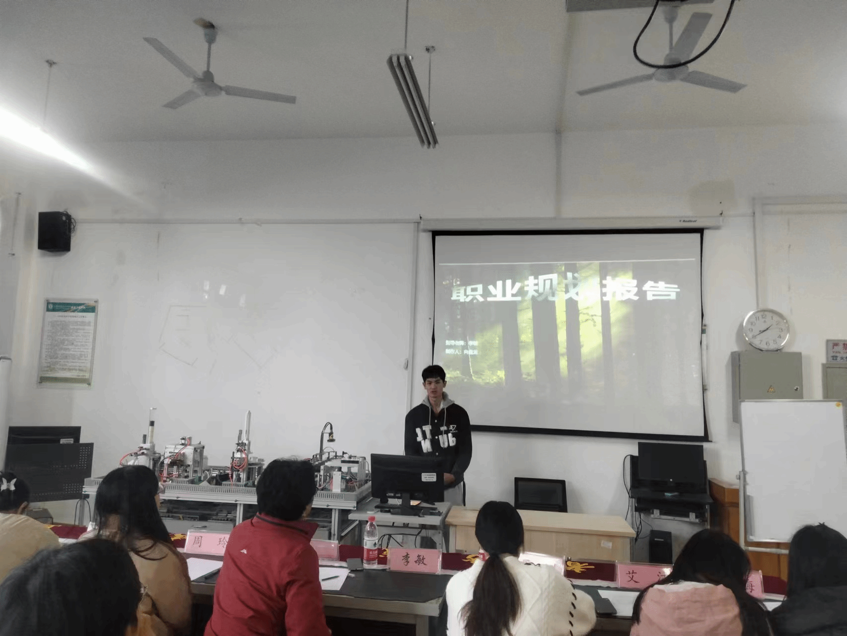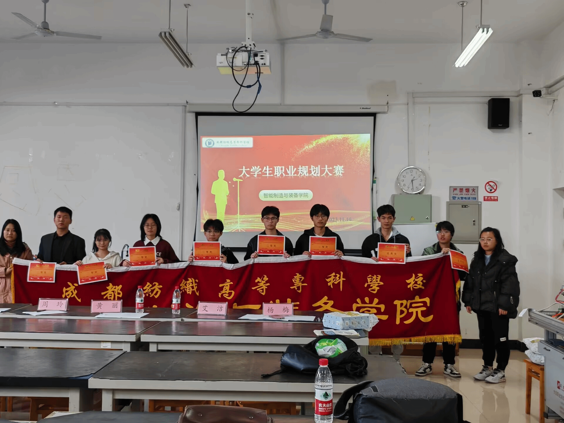 比赛由卢江帅同学主持,首先讲解了比赛规则和评分标准,紧接着参赛选手们按照报名顺序依次进行演讲。同学们从职业目标、行动成果以及目标契合度三个方面对自己将来的发展目标以及努力方向进行了分析。每个同学演讲完毕之后评委们对参赛者进行了点评,指出了选手们不足之处,以待后续改进。随着最后一位同学演讲完毕,裁判团计算每位参赛选手的平均得分,荣获此次职业规划大赛一等奖的是机器人212明翼同学,二等奖获得者是电梯212何攀同学和电梯222王竹同学,三等奖获得者是机本221张栏同学,汽修231周志豪同学和机器人231吴仲宇同学。最后由杨梅老师为获奖的同学颁发奖状及发放礼品,参赛选手们合影留念。