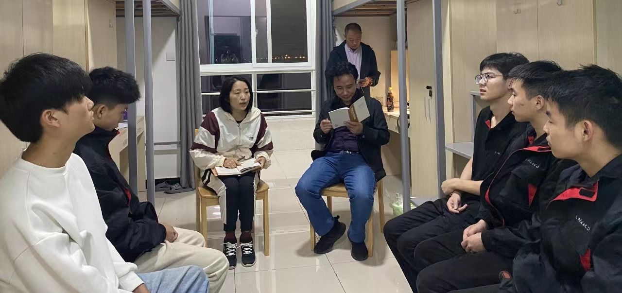 2023年10月24 日智造学院开展吉利实习工厂宿舍团建活动。总支书记曹选平,党总支副书记兼团总支书记李敏和专职辅导员尚丽华老师去往吉利工厂看望大三实习同学。