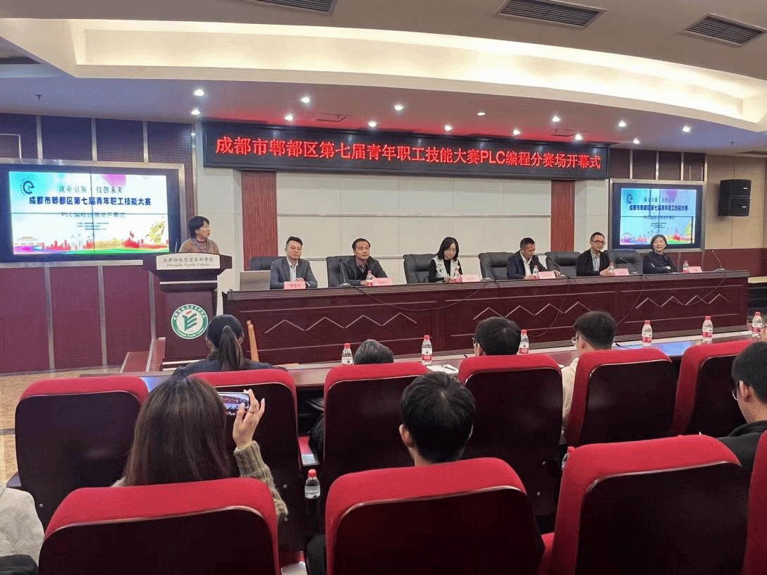 成都市郫都区第七届青年职工技能大赛PLC编程竞赛开幕式于10月17日在公司举行,此项赛事由成都市郫都区人力资源和社会保障局主办,是为大力实施创新驱动和人才优先发展战略,加快培养和选拔适应郫都区智能制造产业发展需要的高技能人才,让更多技能人才感召郫都、留在郫都、扎根郫都而举办的一场专业比赛,郫都区就业局蔡昌林局长、钟小燕局长、智能制造产业协会秘书长马骏、三亿经理罗纲等出席了开幕式,来自郫都区专精特新企业的38名技术骨干参加了本次比赛,比赛采用当前智能制造领域最先进的PLC设备,对选手技术技能水平要求很高,三亿中德SGAVE实训室作为大赛主赛场,罗纲经理担任此次大赛的裁判长。